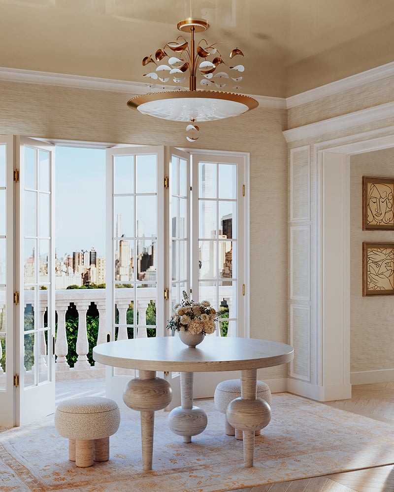 A nod to Finnish designer, Paavo Tynell, Paavo is like artwork suspended from the ceiling. Delicate discs of soft-white plaster and gold leaf cascade above an opal glossy shade surrounded by more gold leaf. Two additional discs hang below the finial adding even more visual interest. Light fills the underside of the floating discs and casts a beautiful golden glow.