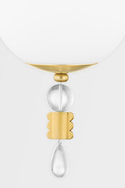 Reminiscent of drop earrings, Perla is jewelry for the ceiling or wall. An opal matte glass globe is capped on the top and bottom by aged brass. A sparkling ball of crystal sits atop the globe and more custom-designed baubles of brass and crystal dangle beneath. Attractively designed to attract attention, Perla adds a stylish statement to any space.