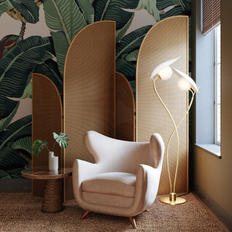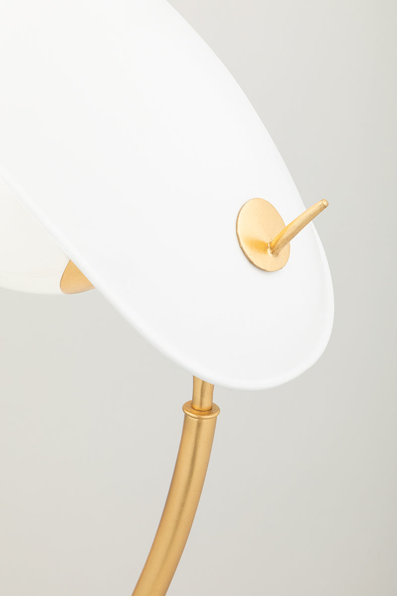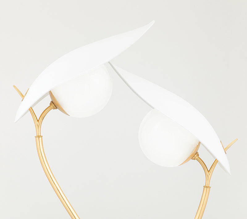 True to its namesake, Frond is inspired by nature. A smooth, sleek, leaf-shaped shade of textured white plaster delicately hangs over an opal glossy glass globe. Curved arms of brilliant gold leaf pierce the shade and hold the globe's metal cap, adding to the design's overall sculptural feel.