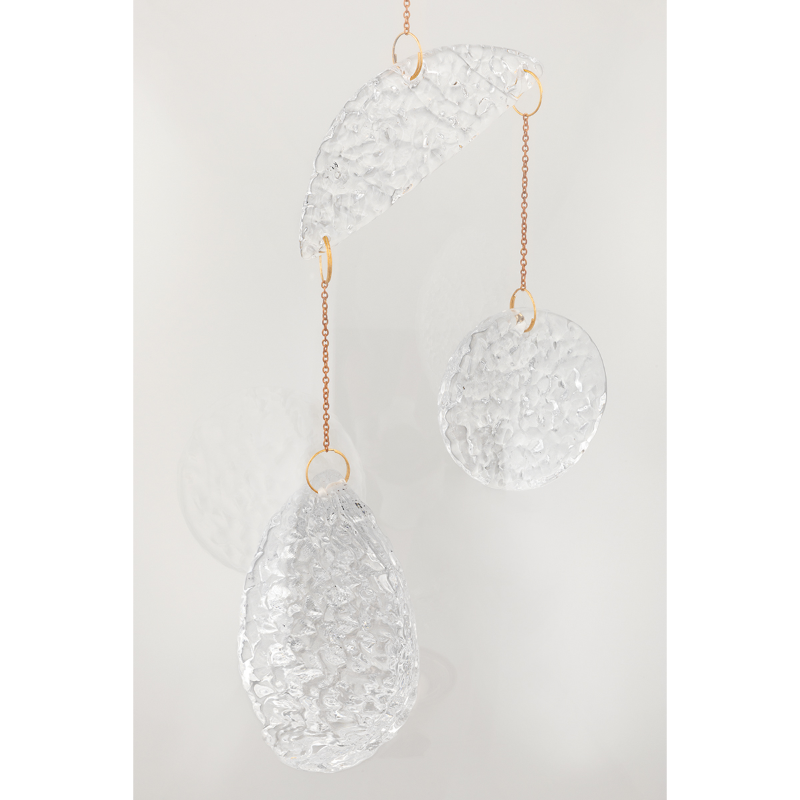 Lighting that doubles as an art exhibit, Gio draws the eye and captures the imagination. A series of clear piastra glass charms are suspended inside a clear glass globe. With the light source housed in the aged brass holder, illumination from the top fills the globe and beautifully highlights the charms displayed within.