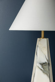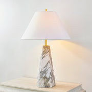 Featuring a pyramid-shaped base of honed Arabescato Corchia marble, the Benicia table lamp stands with a statuesque presence. Evoking a sense of permanence, the polished stone contrasts with the soft white linen of the shade.