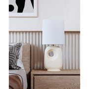 At the intersection of hard and soft, you'll find Harbor Park. Delicate, round shapes are intentionally carved within smooth pieces of a hard, stone-like material. The result is a form that is both tranquil and thought-provoking. The satin ivory finish adds to the peacefulness of this table lamp.