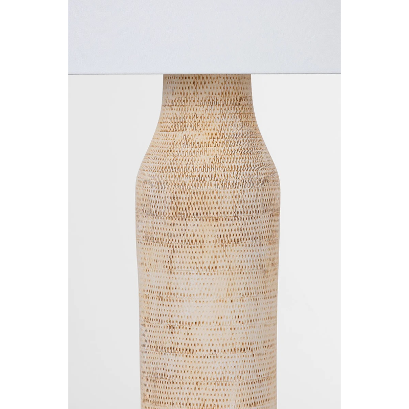 Inspired by the decorative tiles and rugs found in Moroccan markets, the Medina table lamp features a ceramic base covered with an intricate, weave-like pattern. A white linen drum shade complements the base with its neutral color, grained texture, and oversized silhouette. When illuminated, light reflects off the Aged Brass hardware at the neck, adding a subtle glimmer to the design.