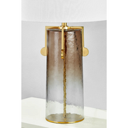 Taking inspiration from bespoke hardware details found on high end furniture, Wildwood makes a statement that is equal parts tailored and poetic. A smoky ombre glass base provides the perfect amount of transparency to appreciate the clean lines and circular forms of the Aged Brass metalwork. A large white linen drum shade balances the ethereal quality of this statement lamp.