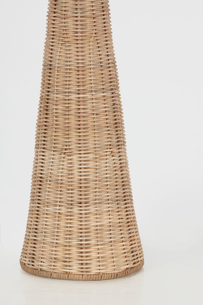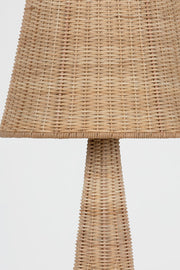 Merging the organic materiality of rattan wicker with a fashion-forward frame, Fair Haven masters the grand millennial aesthetic. Resembling the elegant flow of a skirt, the wicker base tapers in at the top, allowing light to shine over the intricate weave. The Aged Brass hardware complements the approachable warmth of the rattan.
