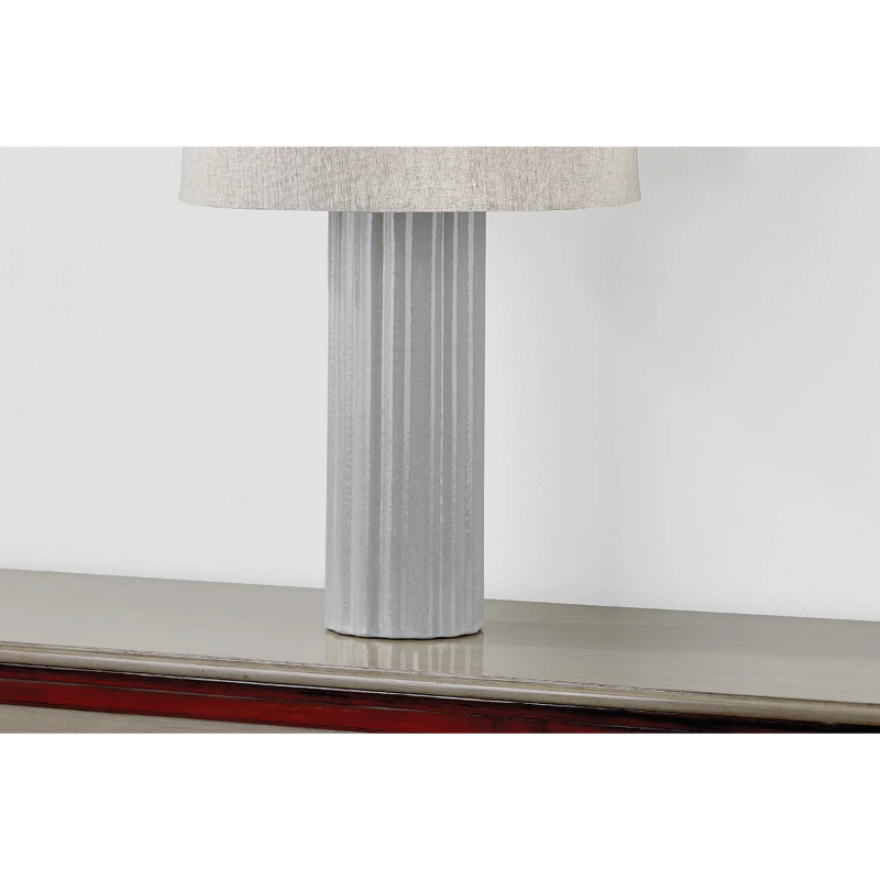 Drawing inspiration from the grandeur of the columns of ancient Greece, the Manchester lamp serves as a contemporary essential for transitional spaces. The slender ceramic base features whimsical fluting and a shell grey finish, lending an artisanal quality. The base’s narrow diameter is contrasted by the visual weight of the large natural linen drum shade. *Due to the one-of-a-kind nature of the medium, exact colors and patterns may vary slightly from the image shown.