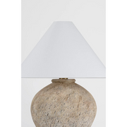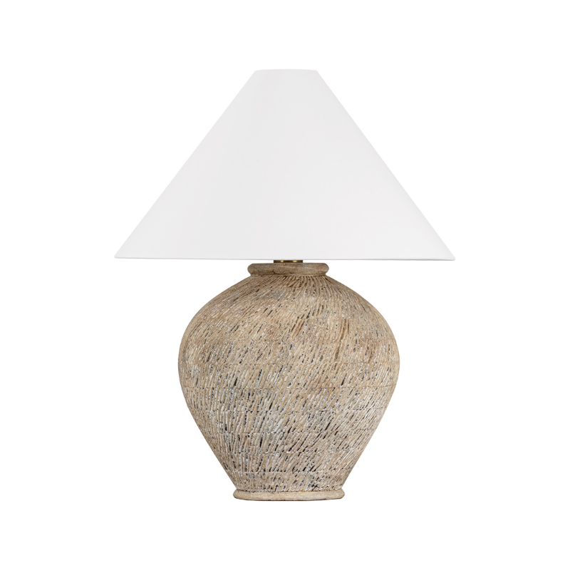 A textural delight, Rumbrook features a tactile ceramic base with an etched treatment across its naturally porous surface. The unique base allows light and shadow to play within the grooves, creating a visually dynamic statement piece. A white linen shade tops this table lamp, adding a classic, fresh note to balance the earthy base.