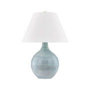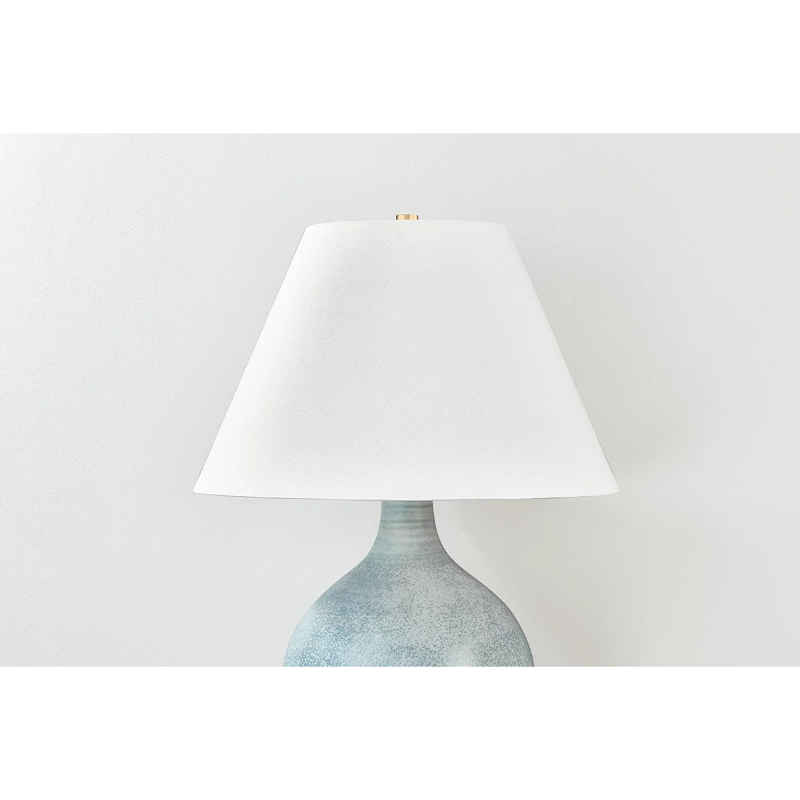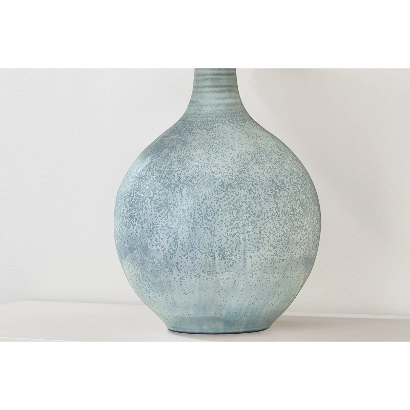 Inspired by an antique jug, Kearny features a gourd-shaped ceramic base with a painterly treatment. The variations of blue in the glaze add interest while connecting this artistic table lamp to the outdoors. The conical white linen shade offsets the base with a contemporary lift.