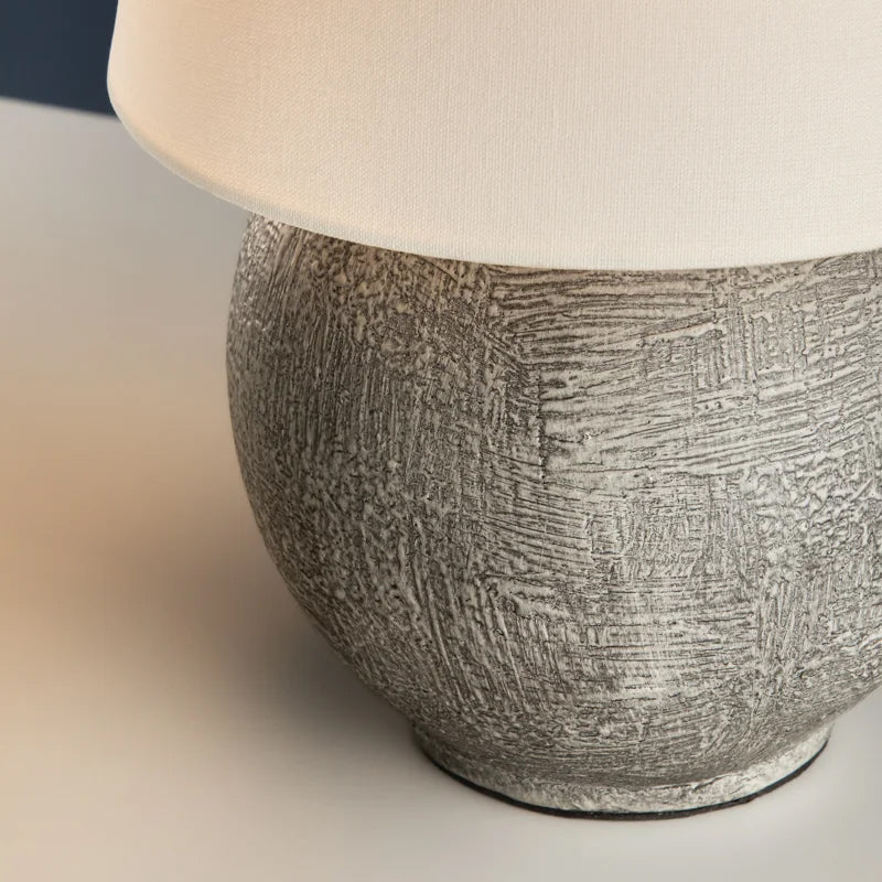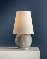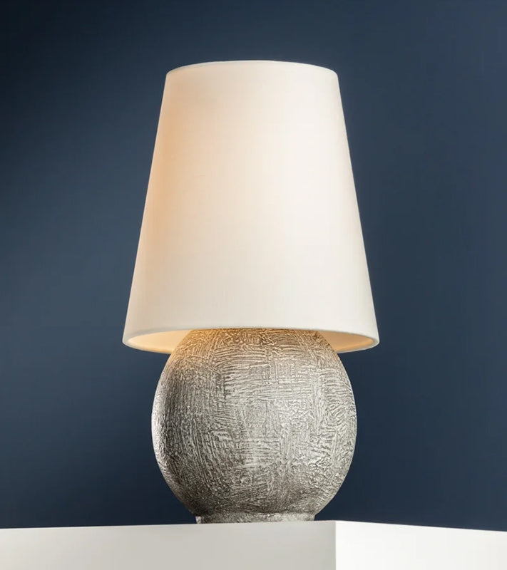 A celebration of unique proportions, Ulsterville features an oversized linen shade paired with a spherical ceramic base. While this dimmable lamp is petite, the textured finish gives it an artifact-like charm that makes it stand out as a focal point. Equipped with rechargeable LED lighting, Ulsterville is portable for versatile styling. The battery life is dependent on the brightness level set by the user, and it recharges in 3.5 hours.
