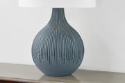 The unique drip-like finish of the gourd-shaped Nepperhan is the focal point of this design-forward lamp. The speckled blue ceramic base has an impactful carved striation pattern descending partially down the fixture to create a sense of movement.