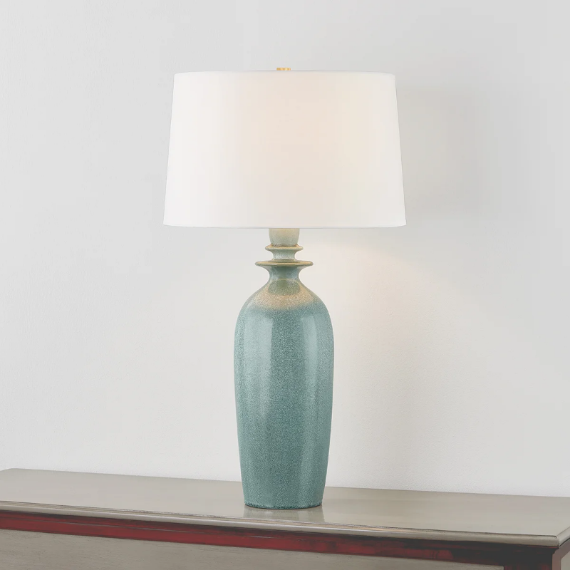 Featuring a slender, speckled blue ceramic base, Bellmawr is the embodiment of artisanal beauty. Two wide flanges accent the neck, adding a hint of modern flair to the otherwise understated design. A wide, white drum shade contrasts with the slender base, creating a sense of lift from the tabletop. Β