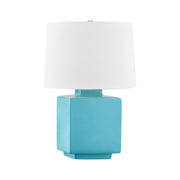 Inspired by the sea, this table lamp features a turquoise ceramic body in a sleek cube design. A large white linen shade complements the shape of the base, offsetting the glossy reflection of light with a matte glow. Adding a touch of sophistication, the subtle Aged Brass frame glimmers at the lamp's neck.