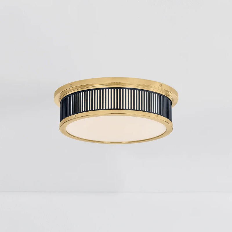 By blending classic and contemporary elements, the Ashdown family offers a new take on sophisticated ceiling lighting. Available in both square and rounded shapes, these flush mounts feature Mark D. Sikes' signature brass screw accents and a white glass shade. The distinctive geometric perforations on the frame provide another decorative detail.