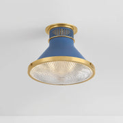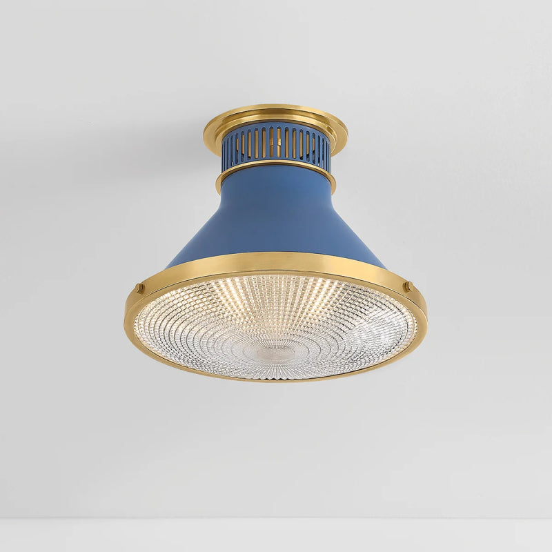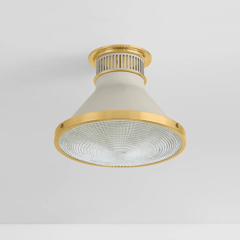 The Highclere family blends industrial and classic elements to create a modern, elevated basic. Etched for added texture, the clear optic glass shade creates a beautiful diffusion of light while the bell-shaped silhouette of the shade is accented by Mark D. Sikes' signature brass screw detailing.