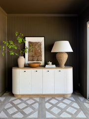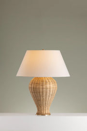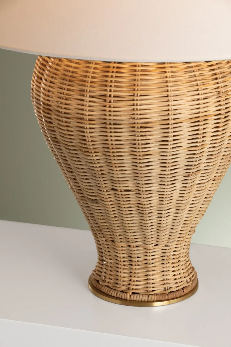 The playful proportions and high textural interest of the Chatsworth table lamp bring a sense of refreshment to any space. The voluminous silhouette features a woven wicker base that widens at the top and tapers down to a more narrow point. A slender Aged Brass cuff adds a luxurious touch while the off-white linen shade lends a classic look. With its thoughtfully crafted details, Chatsworth is a natural charmer in any space.