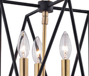 Laszlo makes a stunning first impression. A polished, tightly-scaled candelabra resides at center. Contrasting it in a dizzying geometric frame are two overlapping triangles in textured black metal. Traditional lamping and avant-garde abstraction juxtapose in a fixture whose allure brings us into the now.