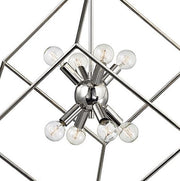 Tumbling cubes overlapped in frozen motion surround a modern-style lighting cluster in this breathtaking fixture. Inert textured black iron contrasts with a metallic finish at the core. It has been said all good design is about tension. This chandelier for the Atomic Age celebrates the tension that keeps the universe and the atom alike in perfect place.