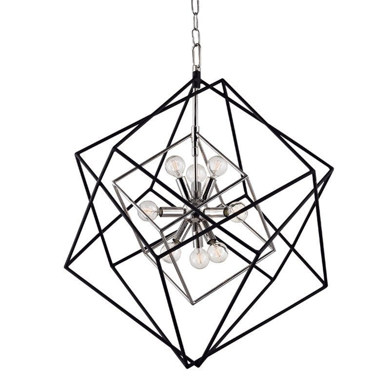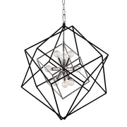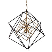 Tumbling cubes overlapped in frozen motion surround a modern-style lighting cluster in this breathtaking fixture. Inert textured black iron contrasts with a metallic finish at the core. It has been said all good design is about tension. This chandelier for the Atomic Age celebrates the tension that keeps the universe and the atom alike in perfect place.