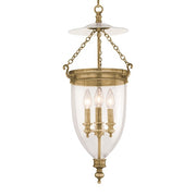 Embellished hangers anchor Hanover’s three brass chains, while a glass smoke bell warmly diffuses light across an expanse of upward space. Patterned after the signature lanterns that graced royal foyers during the English Regency, Hanover refines a classic for the perfect balance of filigree and shadow.