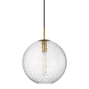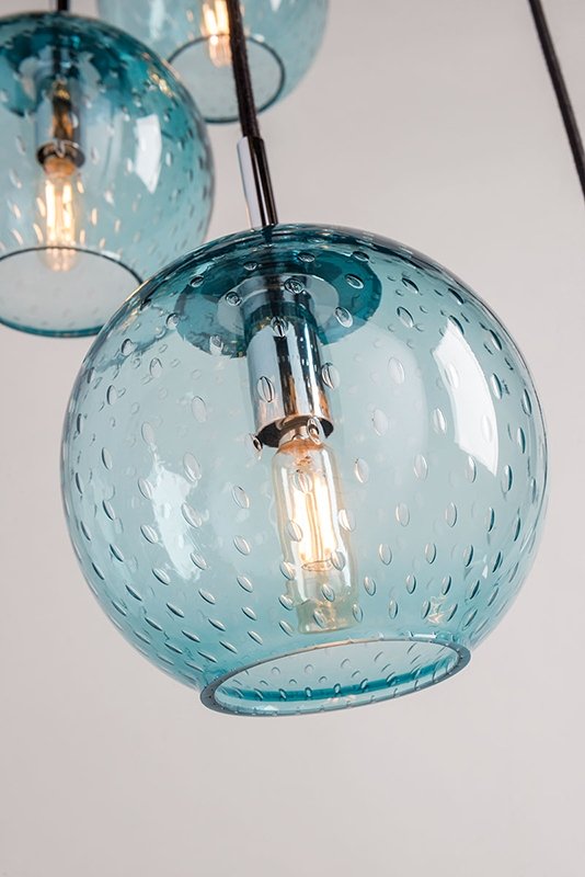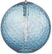 Thick mouth-blown glass with a discrete pattern of bubbles domes around a warm incandescent bulb. At its base, the globe has an opening, which allows you to manually change the bulb. Smooth woven cords add an urbane touch. Exciting options in our Rousseau family include several fun colors and the choice between hanging a single pendant or a staggered cluster.