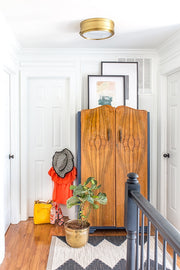 Whether on the ceiling as a flush mount or on the wall as a porthole sconce, Rye makes a handsome addition to a room. Clean lines and simplicity guide the piece. Its only bit of whimsy is a faux hinge, there for ornamentation. Its front lifts off when the tiny ball across from the hinge is unscrewed.