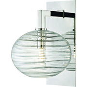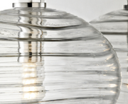 The glassmaker’s craft of using an “optic mold” to create desired interior textures and designs was invented by Roman glassworkers and flourished in Venice in the Middle Ages. Using this ancient “optic” technique, we house a glass bulb in a hand-blown oval diffuser. This diffuser is perfectly clear on the outside with a wavy horizontal pattern worked in its bulb-facing side. These interior lines are in the “optic” tradition, valued in heritage pieces such as Depression glass.