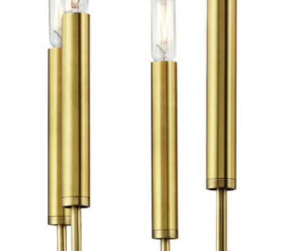 Gideon’s arms are round rods bent at obtuse angles, submerging into long tubes of metal the same diameter as the tubular bulbs which fit into them. In its chandelier form, a large crystal plate at its base, secured between arms and finial, adds just the right accent to Gideon’s minimalism.