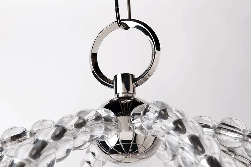 • While the chandeliers’ glamour owes to crystal drops and polished metal rings, their open form enlivens the play of light and shadows.