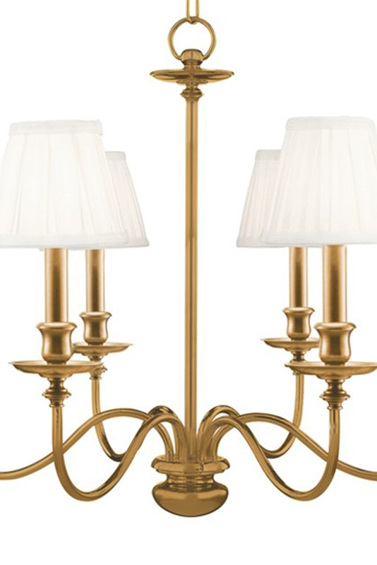 Menlo Park is where Thomas Edison worked with his team to deliver the first functioning system of electric light for everybody. This piece alludes to the styles of the candle-bearing fixtures around the time of this momentous invention. Using the elegant form of an open colonial chandelier, we keep it simple and sleek-lined, with shapely candlecups and bobeches. Unity of finish and soft pleated shades help Menlo Park attain a higher level of sophistication.