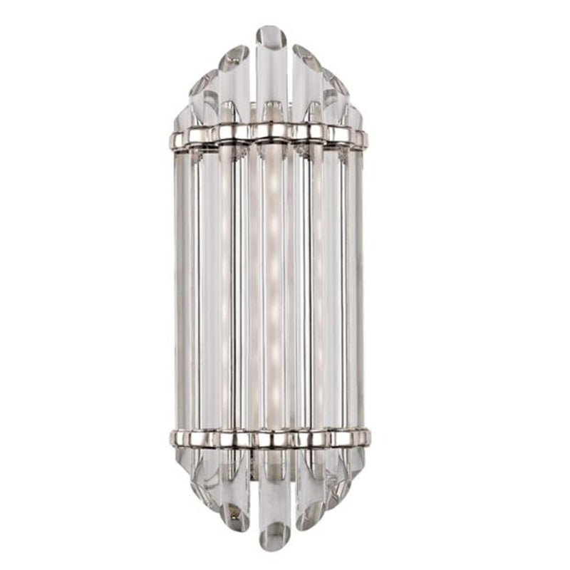 Fluted cast metalwork clasps Albion’s shimmering array of polished rods. The broad rods, beveled on each end, are arranged in tapering order before a frosted glass diffuser. Combining the bright light and energy efficiency of LED with the glamour of Art Deco style, Albion is a winning wall sconce or bath and vanity piece, sure to endure in both style and substance.