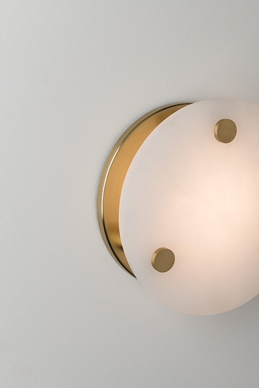 We layer a disc-shaped slab of alabaster, hewn from Spanish quarries, over an LED light source. Alabaster is such an excellent diffuser of light, it has been used for windows in places of high seriousness since antiquity. The combination of cutting-edge lighting technology and archaic materials makes for a compelling light fixture.