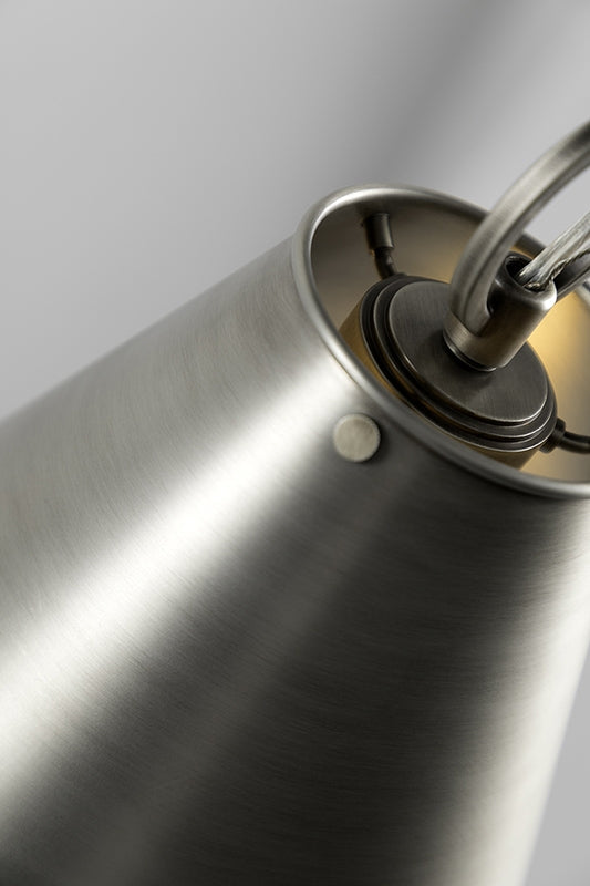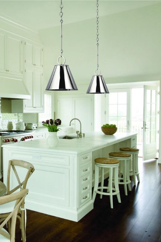 A perennial favorite for kitchen islands but just as suitable to numerous other locations, Altamont is available with either metal or paper cone shades. In cast metal, these shades showcase sumptuous finishes, rivet and seam details creating a refined industrial look. Paper shades allow light to pass through rather than funnel out and down. Accent details along the the unique ring-and-rod chain and wide hoop holders contribute to the impression Altamont makes.