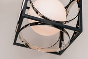 Geometry is the study of figures in a space of a given number of dimensions and of a given type. Our Wadsworth brings the circle and the square of this ancient science to an artistic three-dimensional setting, with an opal glass sphere shade poised at the heart of a textured black cube.