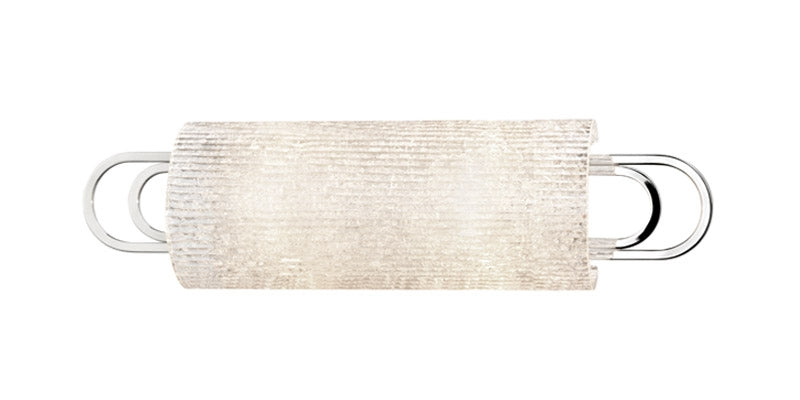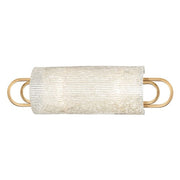 The handmade glass that artfully distorts the light in our Buckley family is unique. Clean, ribbed glass faces inward from the ovalesque piece. Broken chips of glass have been fused onto the back, causing a refractory effect. A double band of thick square metal mounts the fixture.