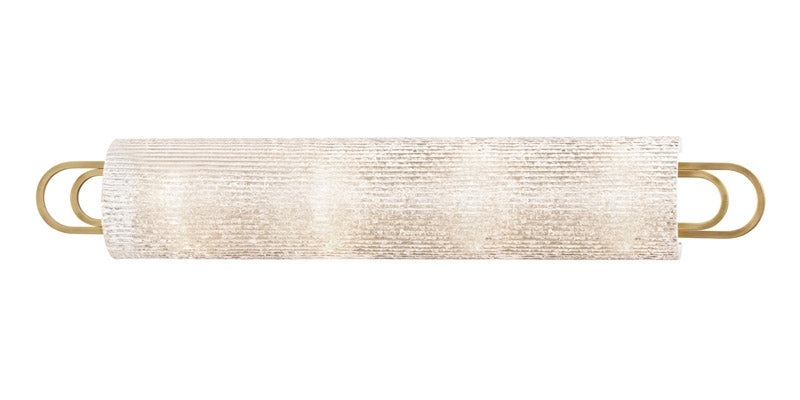 The handmade glass that artfully distorts the light in our Buckley family is unique. Clean, ribbed glass faces inward from the ovalesque piece. Broken chips of glass have been fused onto the back, causing a refractory effect. A double band of thick square metal mounts the fixture.