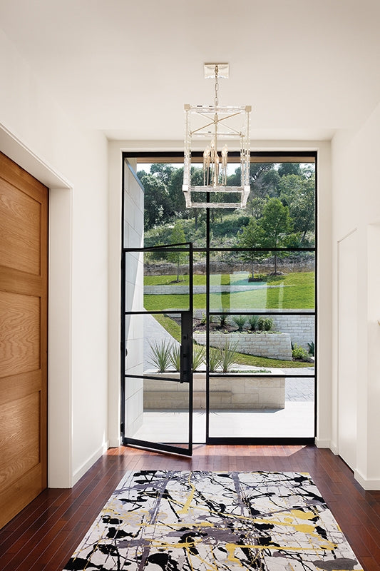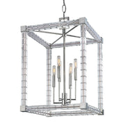 The fixture’s unexpected impact comes from its futuristic materials and shapes and its icy crystal cubes, stacked along the metal frame. Subtly staggered clusters of candelabra lamps cast a sparkling glow along this prismatic frame, playing a brilliant light pattern across any room. Polished Nickel preserves the fixture’s winter chill while Aged Brass accents add warming contrast.