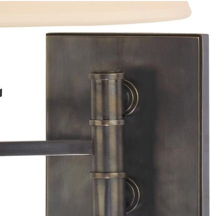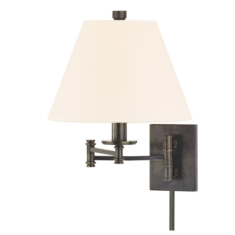 An English barrel shade caps the refined styling of the Claremont wall-mount, swing-arm lamp. Though unembellished, the candlestick and bobeche bulb base, as well as the ring details at the arm hinges, give the functional lamps a traditional feel. Claremont makes an ideal bedside reading lamp, without taking up any table space. Unlike typical wall sconces, Claremont comes wired with a standard, plug-in cord.