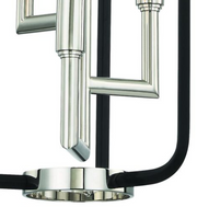 Using a candlestick from the fifties as an inspiration, we designed our Angler family around the idea of staggering bulbs at different heights on off-centered tubular arms bent at sharp ninety-degree angles. The resulting work is minimalist and sophisticated. Two-tone versions contrast the brass or nickel-finished candelabra with a cage of smoothly rounded black metal lines.
