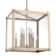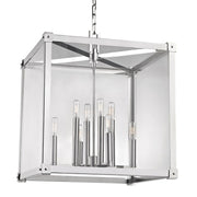 Suspended in a glass cube, exposed-filament bulbs dance in a carousel of nickel, bronze, or brass. Machined edges and pinned corner-sleeves add handsome details to the piece. Its metal frame allows for a dramatic splash of shadow.
