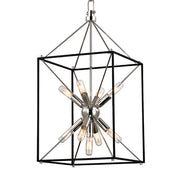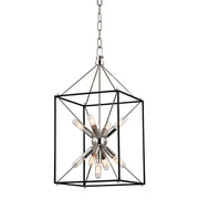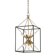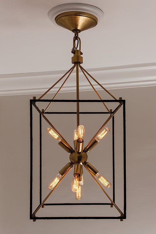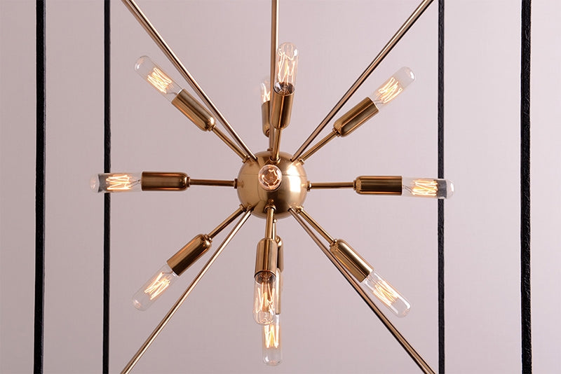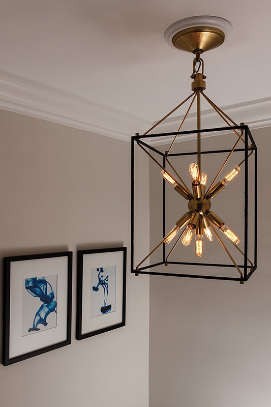 The traditional shape of the lantern, the universal shape of “home”—Glendale inscribes this icon into the air with a textured black metal cube and four metal rods forming a pyramid. At the center, replacing fires of old, we mount a “Sputnik-style” light, a starburst of vintage bulbs glinting off the rich tones of the metal ball. Glendale marries warm retro appeal to forward-thinking design.