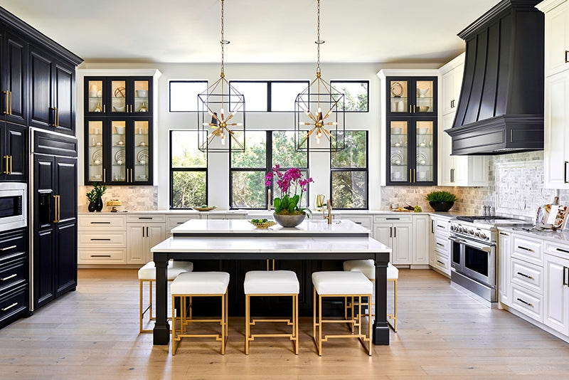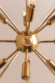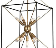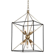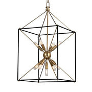The traditional shape of the lantern, the universal shape of “home”—Glendale inscribes this icon into the air with a textured black metal cube and four metal rods forming a pyramid. At the center, replacing fires of old, we mount a “Sputnik-style” light, a starburst of vintage bulbs glinting off the rich tones of the metal ball. Glendale marries warm retro appeal to forward-thinking design.