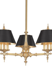 Smooth candlestick colonnades form a classical counterpoint to Cheshire’s extravagant details. The dramatic contrast of matte black shades with cast metal makes a striking design statement. Coordinated shade interiors amplify the hue of our hand-rubbed Aged Brass and Antique Nickel finishes.