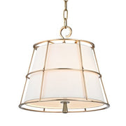 Our Savona family is as handsome as it is unusual. We completely encase the light source in a fine linen shade, then encage the cone in a metal frame, attached with a question-mark hanger loop. A pleasing conical finial of metal extends from the base, finishing the piece off.