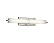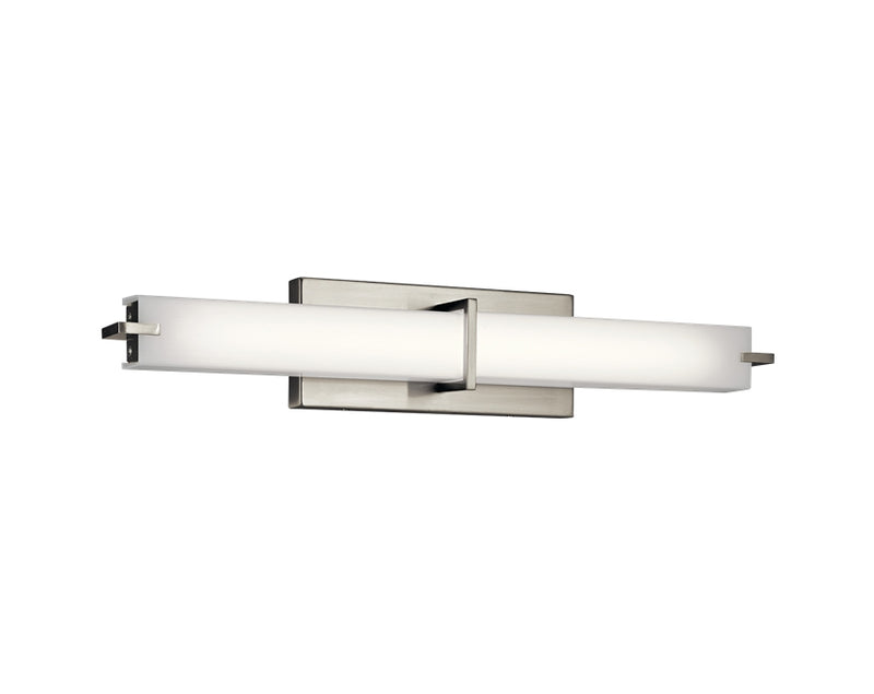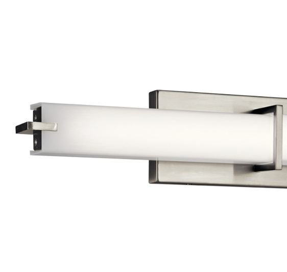 This LED linear wall fixture is a versatile piece. The Brushed Nickel finish and a white acrylic diffuser create a crisp look and bright, clean ambience. Horizontal or vertical mounting options add to the versatility of this fixture.