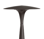 A sculpted spindle center is capped by a broad, shallow roof that diffuses and spreads LED light.