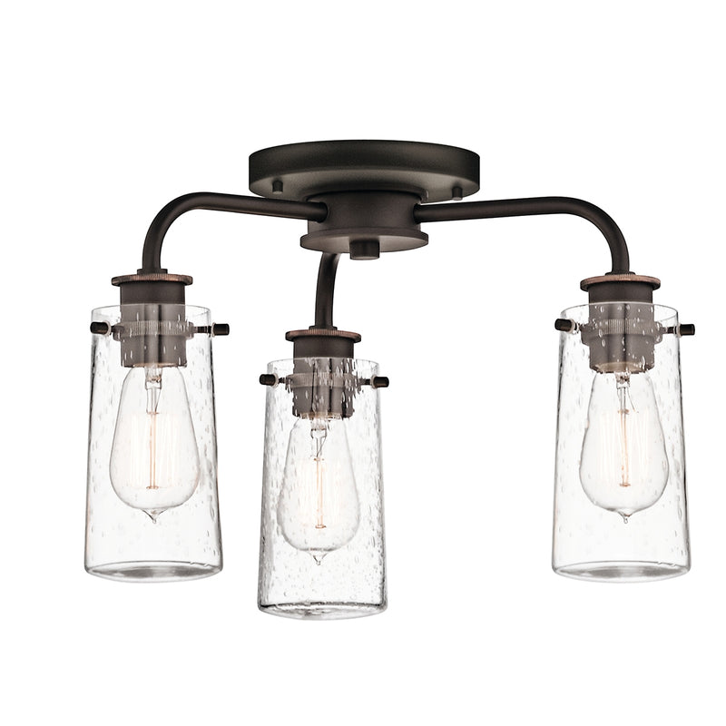 There's so much to love about the reclaimed style of this 3 light semi flush or chandelier from the Braelyn™ collection. The vintage industrial design is punctuated with Clear Seeded Glass shades, reminiscent of glass jars that were a staple of 19th century American life. The Classic Pewter or Olde Bronze® finish and carbon filament replica light bulbs enhance this style, making the fixtures the perfect addition to any spaces.