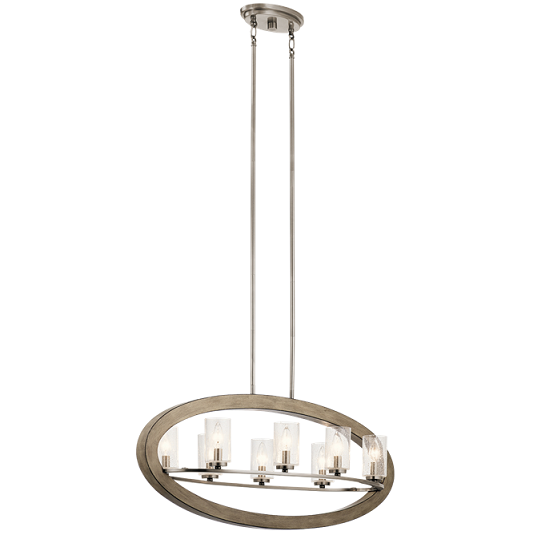 This distinctive 8 light chandelier from the Grand Bank collection creates a bold statement. The rich, Auburn Stained / Distressed Antique Gray finish and Clear Seedy Glass will accent any space in your home.