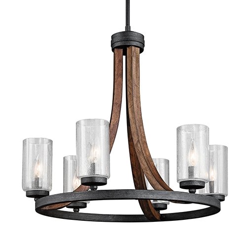 This distinctive 6 light chandelier from the Grand Bank™ collection creates a bold statement. The rich, Auburn Stained or Distressed Antique Gray finish and Clear Seedy Glass will accent any space in your home.