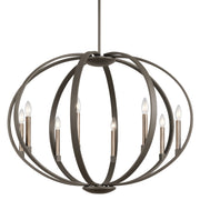 Elata features an orbital look with this 8-light chandelier. This fixture enhances any transitional, contemporary or even soft traditional rooms with the use of a beautiful Classic Pewter or Olde Bronze finish with Natural Brass accents. To finish off the look, Elata utilizes candelabra bulbs nestled along the curves and atop cubes.