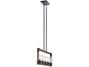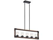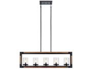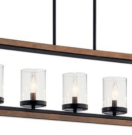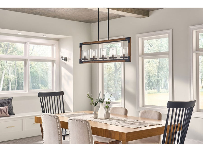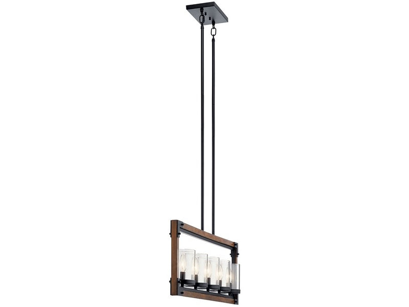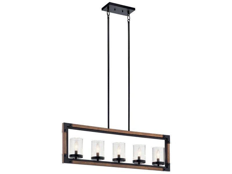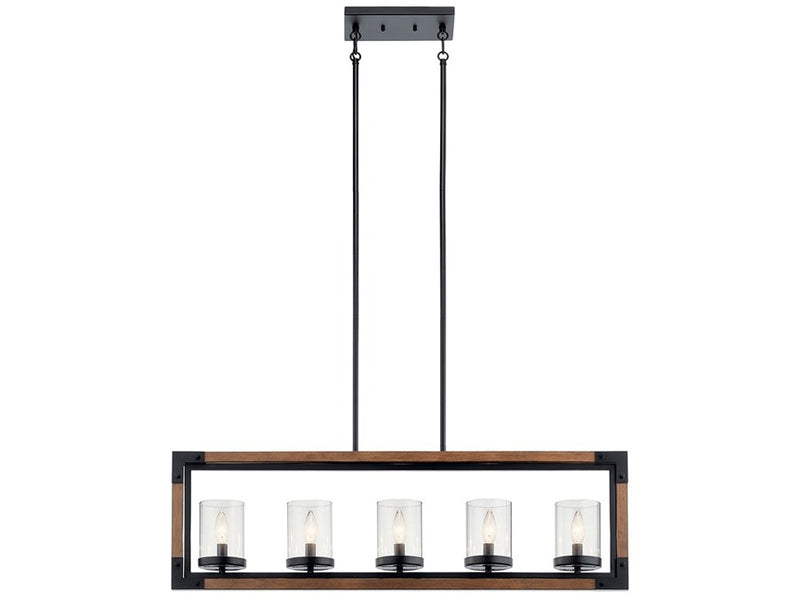 Warm and welcoming tones give the Marimount 5 light linear chandelier a vintage feel. The wood-look structure offers weathered style in a rich Auburn finish, framed in Black metal. Clear glass shades assure the light shines through.